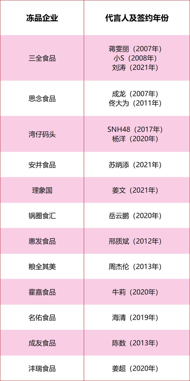 簽約代言人的凍品企業(yè)(據(jù)不完全統(tǒng)計(jì))