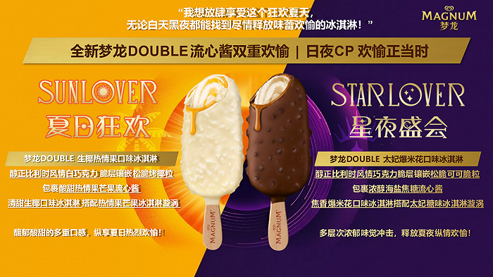 此次品牌煥新,夢龍帶來兩款全新DOUBLE流心醬日夜組合冰淇淋 ——夢龍DOUBLE太妃爆米花口味冰淇淋以及夢龍DOUBLE生椰熱情果口味冰淇淋,黑夜與白天的碰撞與沖擊,點燃炎炎夏日下躁動的味蕾。