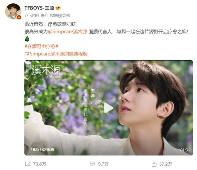 溪木源面膜代言人王源在微博發(fā)布官宣TVC