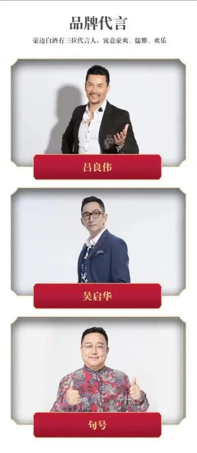 近日,云倉酒莊旗下品牌豪邁白酒簽約中國香港男演員呂良偉(明星代言公司)為品牌代言人,至此,豪邁白酒共有三位明星代言人,分別是豪爽大氣的呂良偉、儒雅風范的吳啟華(明星代言公司)、歡樂隨和的句號(明星代言公司),這也代表了豪邁白酒的理念:豪爽、儒雅、歡樂。