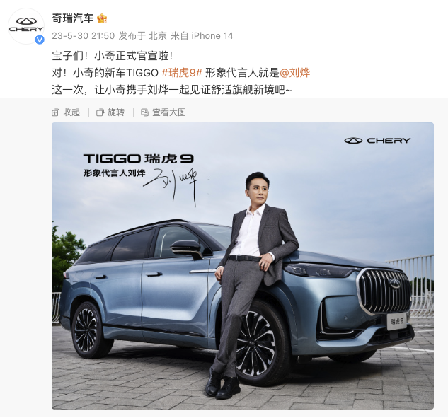 5月30日,奇瑞汽車(chē)宣布,演員劉燁(明星代言公司)成為新車(chē)瑞虎9形象代言人。