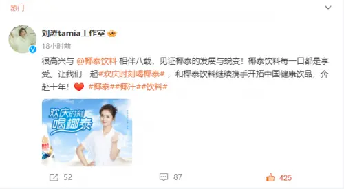 7月25日,著名影視演員劉濤(明星代言公司)在其工作室微博上官宣了繼續(xù)擔(dān)任椰泰椰汁品牌形象大使的信息,并發(fā)布了一段動態(tài):“和椰泰飲料繼續(xù)攜手開拓中國健康飲品,奔赴十年”。