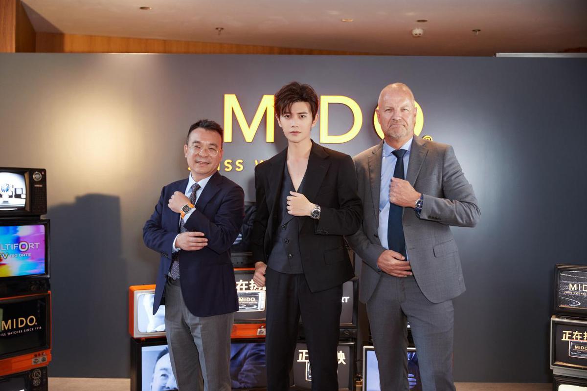 從左至右:瑞士美度表中國(guó)區(qū)副總裁張利民、瑞士美度表品牌代言人任嘉倫、瑞士美度表全球總裁Franz Linder