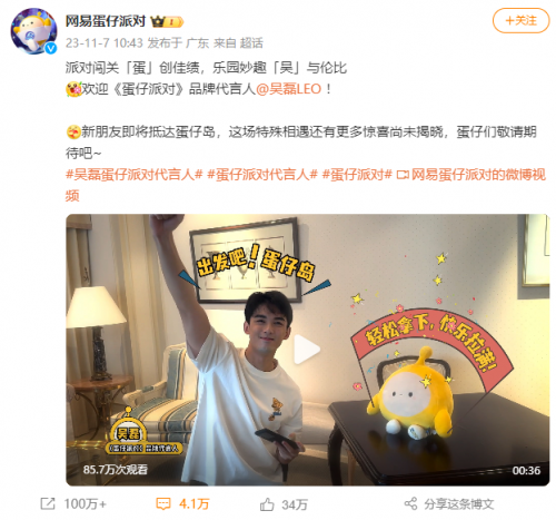 官宣視頻發(fā)布后的短短數(shù)小時(shí)內(nèi),#吳磊蛋仔派對(duì)代言人#、#吳磊在線找游戲搭子#等多個(gè)話題被送上微博熱搜,不論粉絲還是玩家紛對(duì)這場(chǎng)眾望所歸的合作表達(dá)期待。