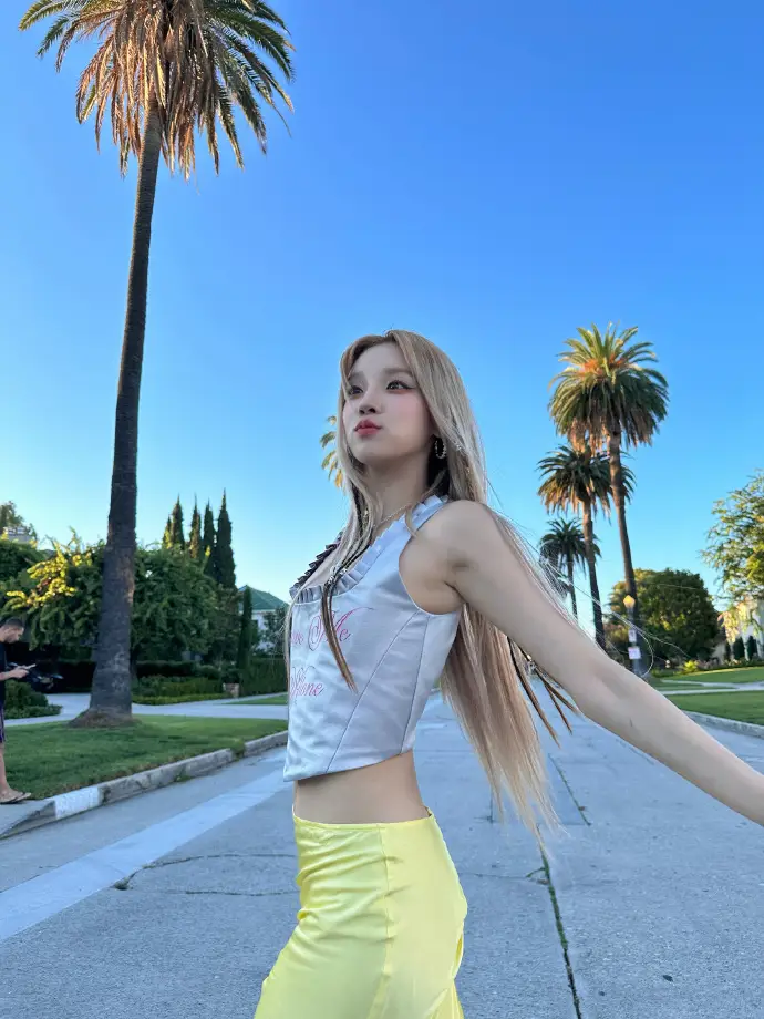 宋雨琦在棕櫚樹(shù)馬路上拍照,笑容青春甜美。