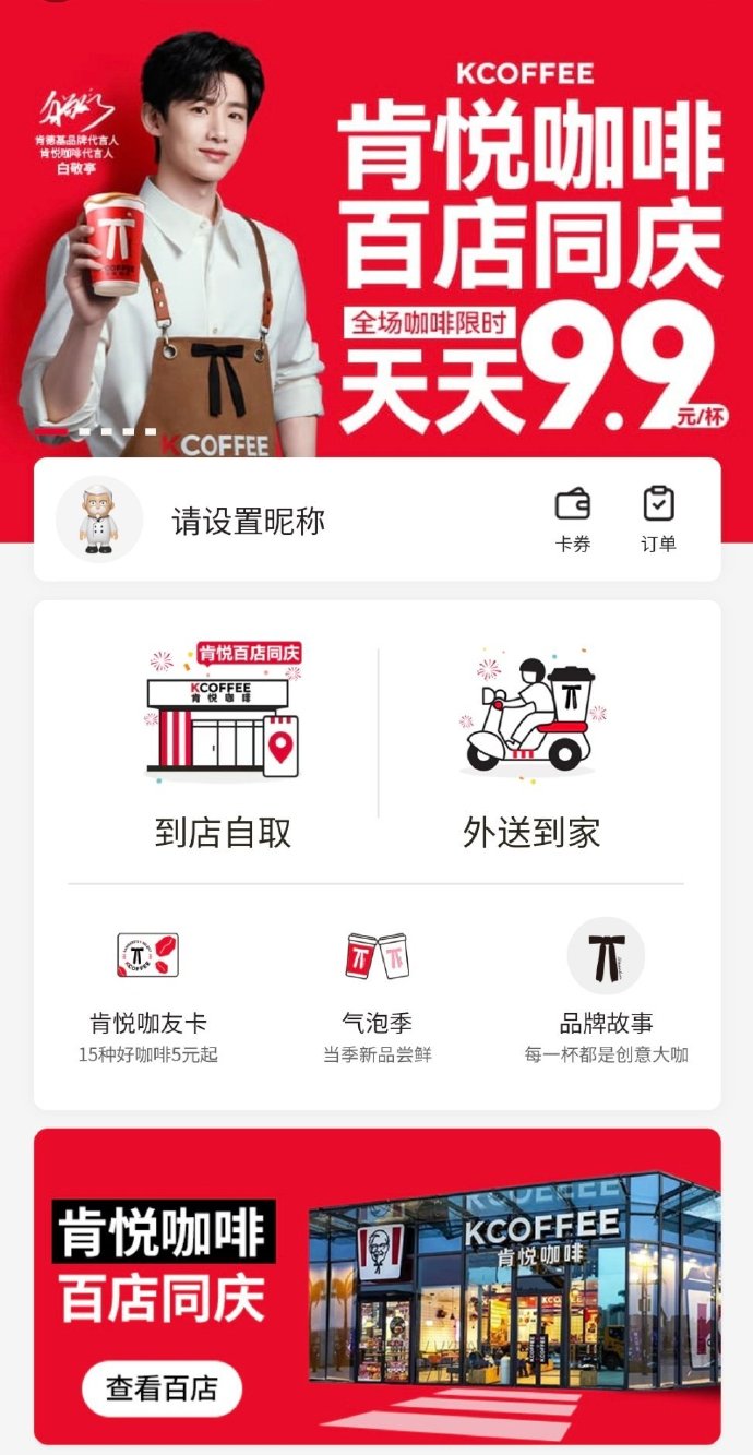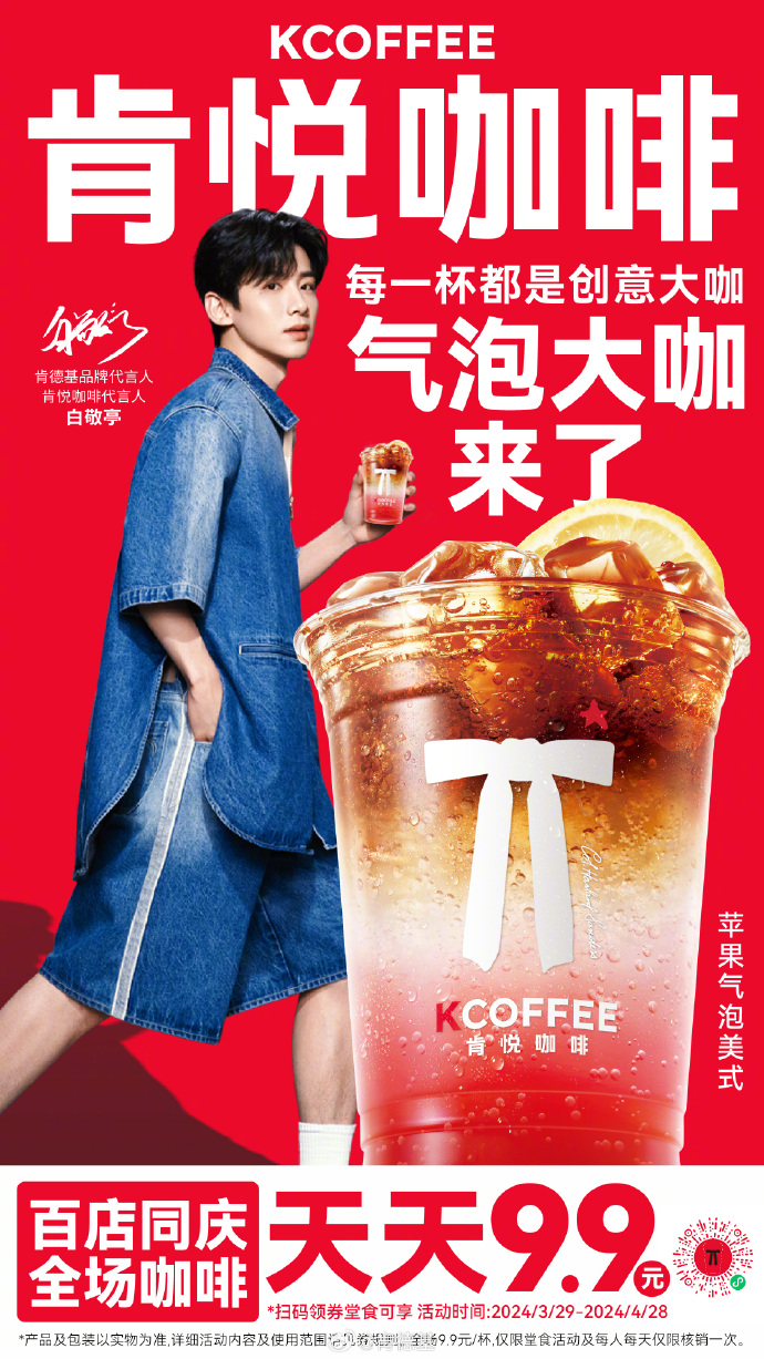 4 月 6 日,肯德基官宣白敬亭(明星代言公司)成為 KCOFFEE 肯悅咖啡代言人,在肯悅咖啡迎來百店之際開啟限時(shí)天天 9.9 元優(yōu)惠活動(dòng)。同期,肯悅咖啡推出「氣泡大咖」新款飲品,加入 NFC 果汁與氣泡水打造別樣風(fēng)味,彰顯肯德基肯悅咖啡的獨(dú)特創(chuàng)意個(gè)性。