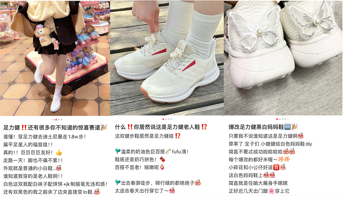 在過(guò)去的十年里,足力健憑借其卓越的產(chǎn)品品質(zhì)和精準(zhǔn)的市場(chǎng)定位,在老年人群中贏得了廣泛的贊譽(yù),穩(wěn)坐老人鞋行業(yè)“頭把交椅”。然而,足力健并未止步于此,而是敢于“擴(kuò)圈”,通過(guò)老人鞋來(lái)觸動(dòng)年輕消費(fèi)者的心。在小紅書(shū)上搜索“足力健”“爆改足力健黑白媽媽鞋”“跟風(fēng)diy足力健好看到了心巴”“足力健爆改瑪麗珍”等話題和調(diào)侃收獲了眾多互動(dòng)。足力健通過(guò)差異化的內(nèi)容運(yùn)營(yíng),萃取獨(dú)特的產(chǎn)品元素,對(duì)原有風(fēng)格進(jìn)行再創(chuàng)新,從而精準(zhǔn)地與不同屬性的人群溝通。讓年輕人覺(jué)得穿足力健是時(shí)尚、也是潮流。在新的價(jià)值觀體系上,足力健構(gòu)建了更符合當(dāng)下時(shí)代的獨(dú)特話語(yǔ)體系,成功破圈年輕群體,贏得了更多年輕消費(fèi)者的認(rèn)同。
