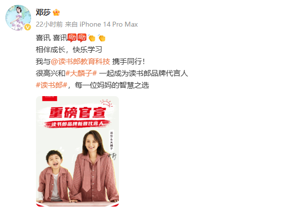 近日,知名演員鄧莎在新浪微博上,官宣將和其兒子大麟子一起擔任讀書郎新的品牌代言人,讀書郎作為中國領先的智能學習設備服務供應商,這一消息無疑為讀書郎品牌的發(fā)展注入了新鮮的活力。