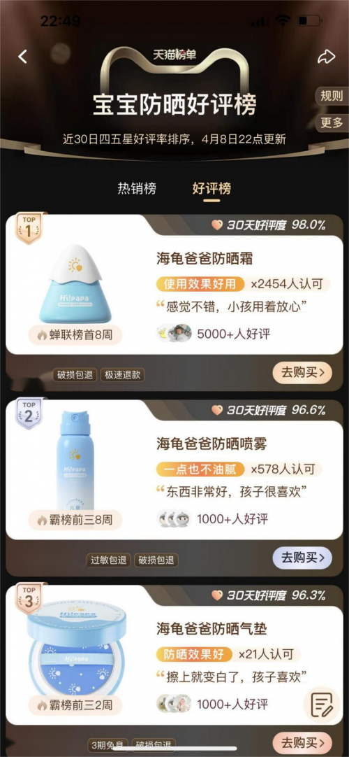 在代言人勢能的持續(xù)釋放與整合營銷組合拳之下,目前,海龜爸爸旗下多款兒童防曬產(chǎn)品在市場上收獲了一眾好評,在主流電商天貓平臺海龜爸爸仍以絕對的品類優(yōu)勢包攬了天貓寶寶防曬熱銷榜&好評榜前3名,銷量口碑依舊遙遙領(lǐng)先。