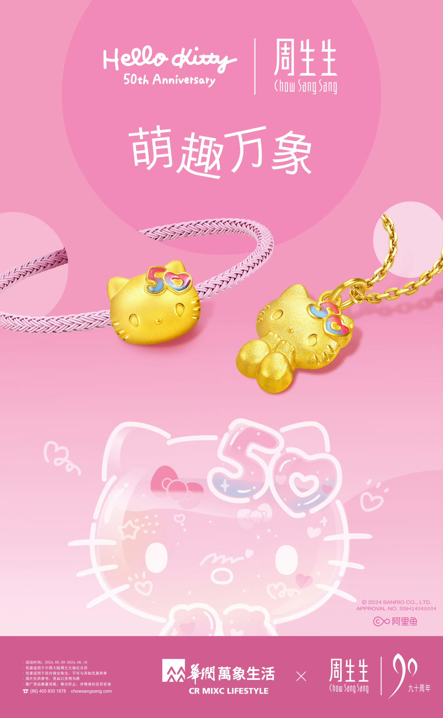 同期,周生生聯(lián)合天貓超級(jí)品牌日邀請(qǐng)品牌大使安宇空降周生生天貓官方旗艦店直播間,與觀眾一起解鎖「可愛(ài)藏不住」的周生生與 hello kitty 合作款 50 周年黃金美飾。
