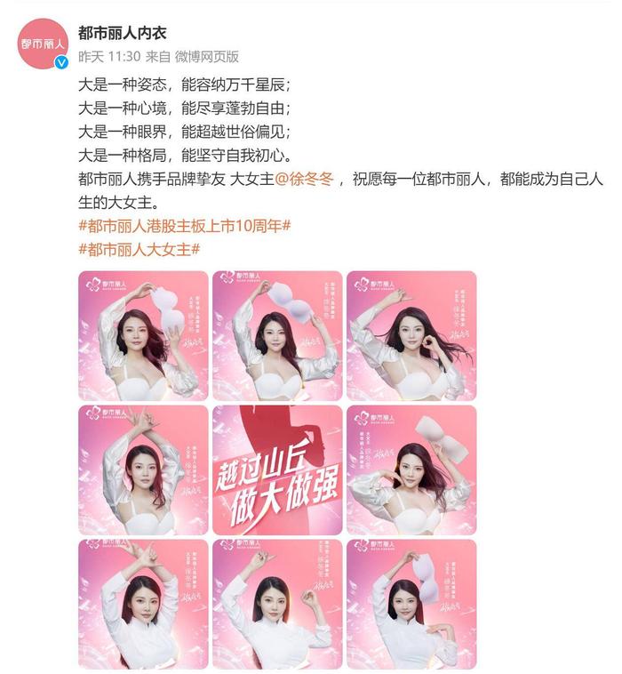 今年是都市麗人創(chuàng)辦的第26周年,港股主板上市10周年,在這個(gè)特殊的時(shí)刻,都市麗人將欣賞和信賴的目光放在徐冬冬的身上,足可見得品牌對(duì)于徐冬冬的認(rèn)可和喜愛。在品牌官宣當(dāng)日,都市麗人發(fā)布了徐冬冬的“大女主”代言寫真,寫真中,徐冬冬以簡(jiǎn)約自信的形象展示著女性的自在與舒適,氣場(chǎng)全開的她與品牌語言和氣質(zhì)契合度超高。