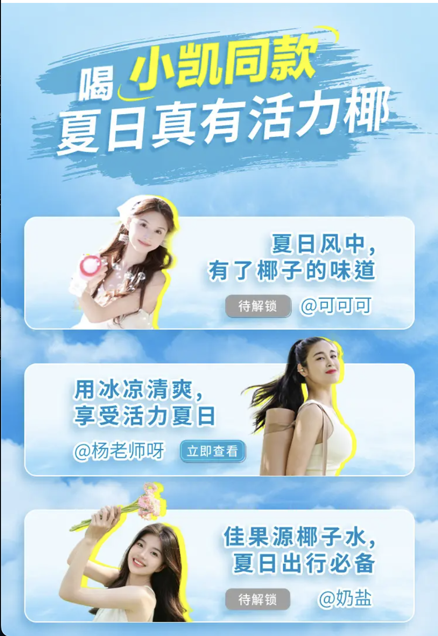 6 月 19 日至 6 月 21 日,佳果源聯(lián)合小紅書(shū)「星官宣計(jì)劃」IP 打造「冒點(diǎn)小汗喝小凱同款」H5 互動(dòng)話題頁(yè),邀請(qǐng)多位時(shí)尚生活博主分享佳果源椰子水飲用體驗(yàn),鼓勵(lì)用戶參與搜索相關(guān)話題,分享椰風(fēng)夏日瞬間,參與積分兌獎(jiǎng)活動(dòng),調(diào)動(dòng)夏日消費(fèi)熱情。