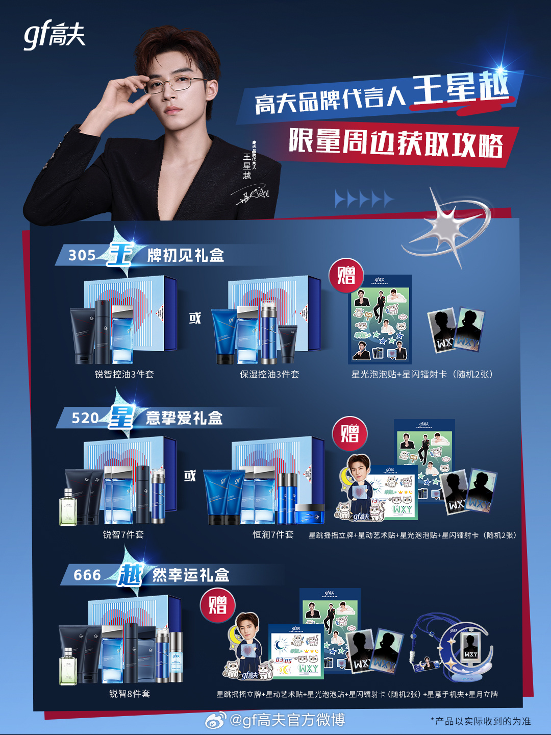 伴隨代言人官宣,高夫特別定制了包含立牌、泡泡貼、鐳射卡等一系列王星越專(zhuān)屬周邊。同期,品牌開(kāi)啟京東小魔方新品日活動(dòng),為粉絲帶來(lái)「王」牌初見(jiàn)禮盒、「星」意摯愛(ài)禮盒、「越」然幸運(yùn)禮盒及代言人親簽、閃卡等福利。