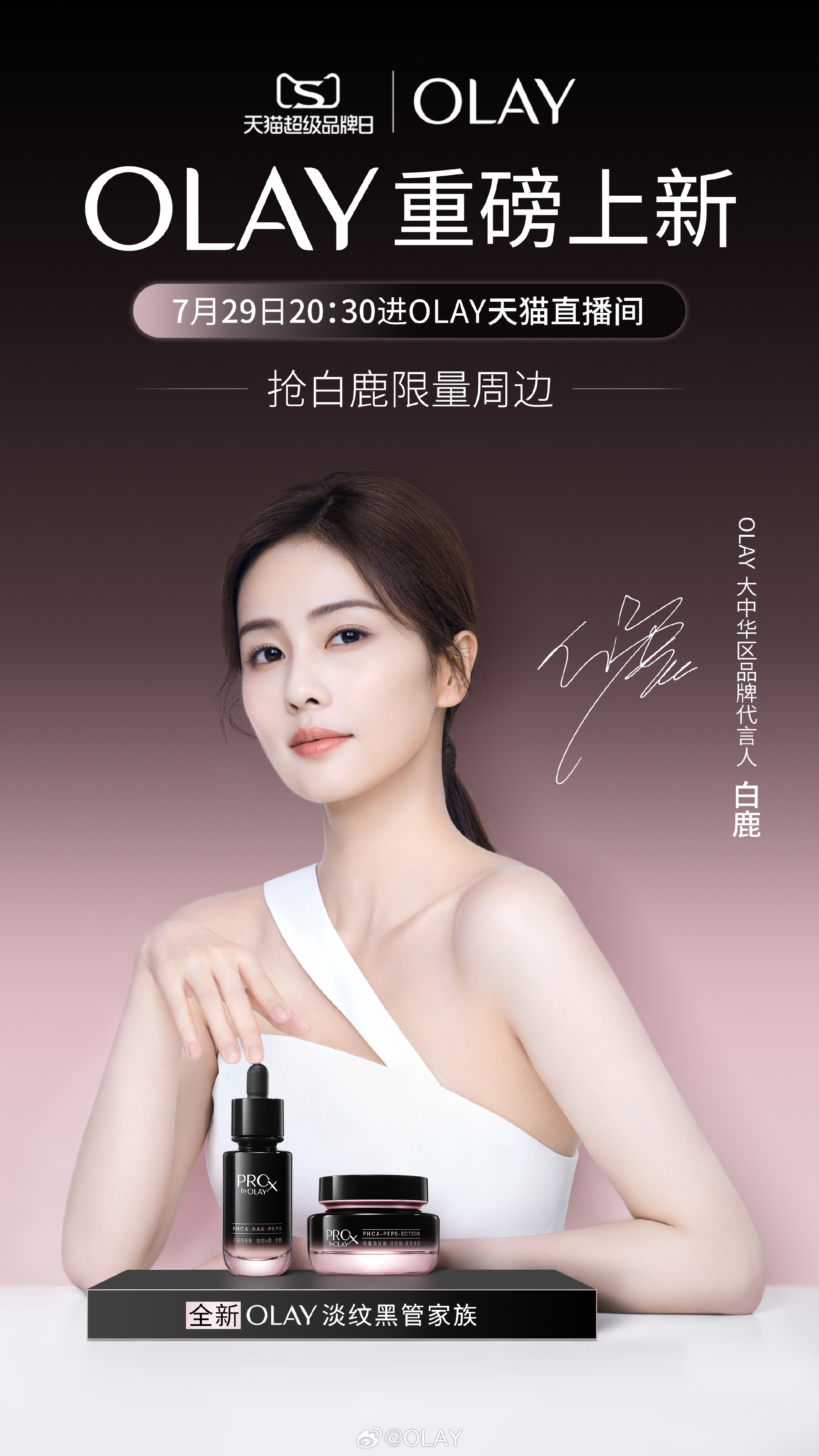 7 月 29 日,OLAY 邀請品牌代言人白鹿空降天貓直播間,帶來 OLAY 淡紋黑管精華新品首發(fā)。同期,OLAY 聯(lián)合天貓超級品牌日打造新品優(yōu)惠禮贈,邀請用戶感受卓效溫和的抗老護膚。