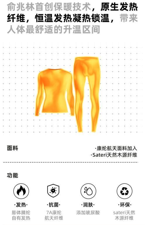 在面料方面,該系列新品材質(zhì)由48%再生纖維系纖維、44.8%腈綸、7.2氨綸組成。膨體腈綸是擁有三層結(jié)構(gòu),具備蓄熱鎖溫科技,能自有發(fā)熱??稻]航天纖維屬于7A級別,能夠?qū)崿F(xiàn)物理抗菌,具備遠(yuǎn)紅外發(fā)熱以及防臭功能。產(chǎn)品還采用Sateri天然木源纖維,環(huán)保親膚不刺激。玻尿酸的添加,也讓御風(fēng)保暖衣可以具有潤膚保濕功效。同時(shí),產(chǎn)品以雙面抓剪燙工藝制作完成,能幫助體感溫度升溫4.5°C。不止產(chǎn)品,俞兆林還重新定義高端系列御風(fēng)保暖衣的價(jià)格,每套售賣價(jià)僅為129元,通過對行業(yè)的引導(dǎo)力、用戶的洞察力,彰顯國民品牌作為行業(yè)領(lǐng)先者的價(jià)值與能量。