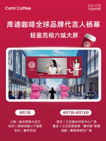 8 月 7 日起,代言人咖茶生活大片也將輕盈亮相上海、杭州、長沙、武漢、成都、重慶六城商圈大屏,供粉絲六城尋「冪」。打卡代言人大屏有機(jī)會獲得咖啡飲品券。