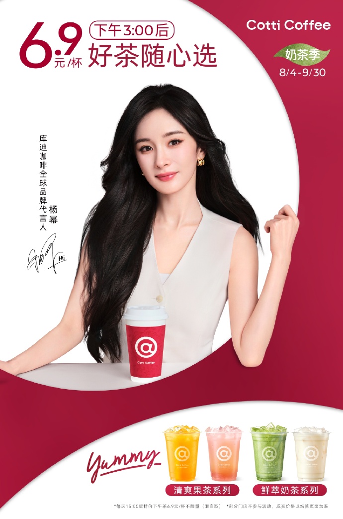 8 月 4 日,庫迪咖啡正式官宣全球品牌代言人楊冪(明星代言公司),并發(fā)布代言人短片。短片中,沿用代言人楊冪擅玩諧音梗的特質(zhì),邀請大家和楊冪一起解鎖好咖好茶好「yummy」,同時(shí)品牌同步上新羽衣系列飲品。