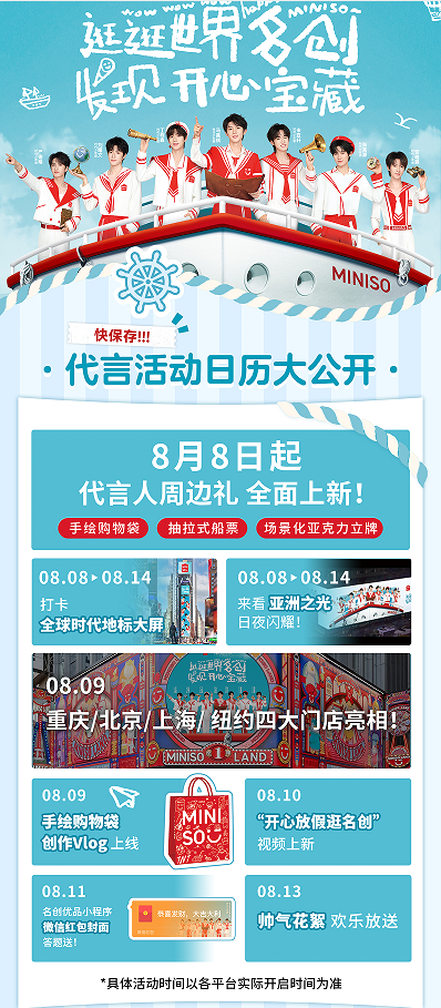 8 月 8 日,名創(chuàng)優(yōu)品正是官宣時(shí)代少年團(tuán)(明星代言公司)為品牌全球代言人。在發(fā)布的官方代言大片中,時(shí)代少年團(tuán)化身七位航海少年揚(yáng)帆出海出發(fā)探尋世界各地的開(kāi)心寶藏,從游歷奇妙的潮玩島嶼、到穿越變幻的季節(jié)之旅、甚至?xí)秤螘r(shí)尚的美妝都會(huì),影片中的內(nèi)容也對(duì)應(yīng)了近年來(lái)名創(chuàng)優(yōu)品在海外的發(fā)展,如今全球 112 個(gè)國(guó)家和地區(qū)都有名創(chuàng)的身影,每一個(gè)角落都隱藏著閃閃發(fā)光的開(kāi)心寶藏,名創(chuàng)優(yōu)品希望大家能夠在時(shí)代少年團(tuán)的帶領(lǐng)下一逛世界名創(chuàng),發(fā)現(xiàn)開(kāi)心寶藏。