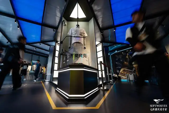七匹狼航母快閃店的正中間設(shè)置了航母藝術(shù)裝置,太空灰巨型齒輪環(huán)繞著仿真航母裝置,營造出一種虛實結(jié)合的科技氛圍感。圍繞著航母裝置,七匹狼巧妙地將主推的三款產(chǎn)品以太空艙的形式進行呈現(xiàn),配合互動裝置,讓消費者直觀地感受衣服的黑科技功能。