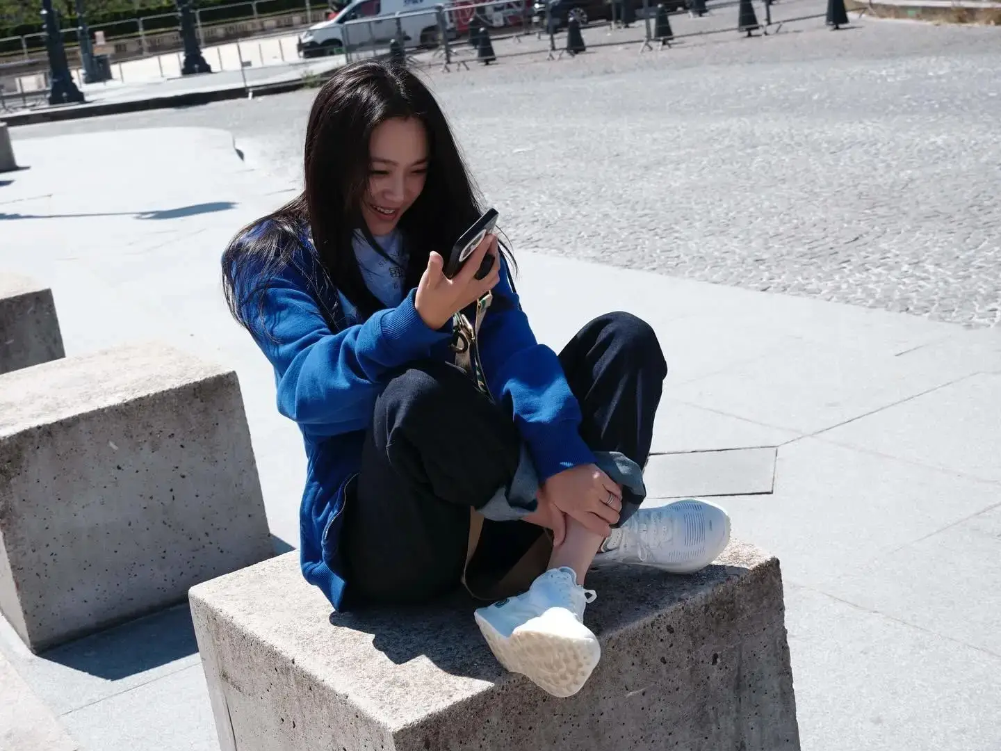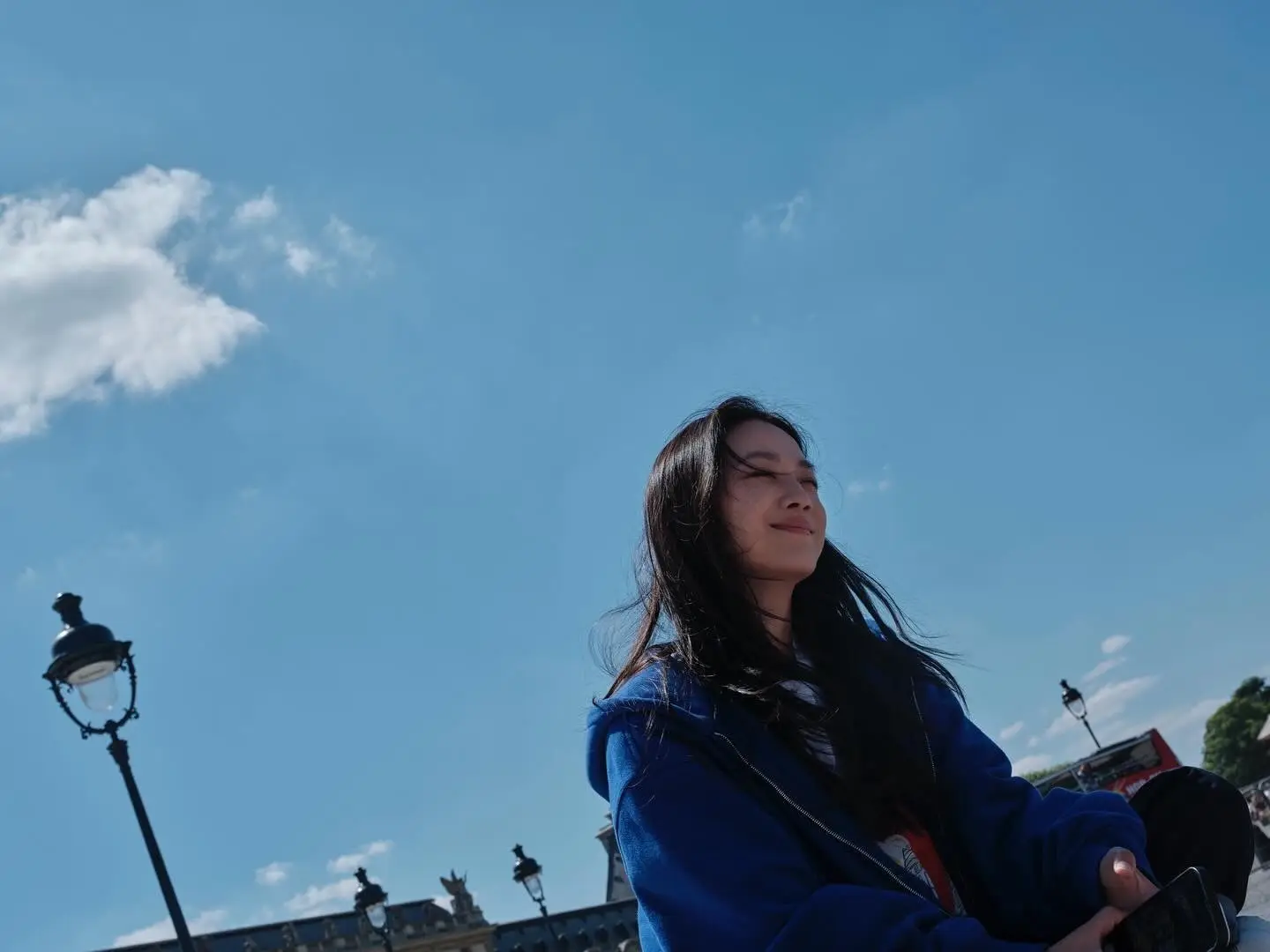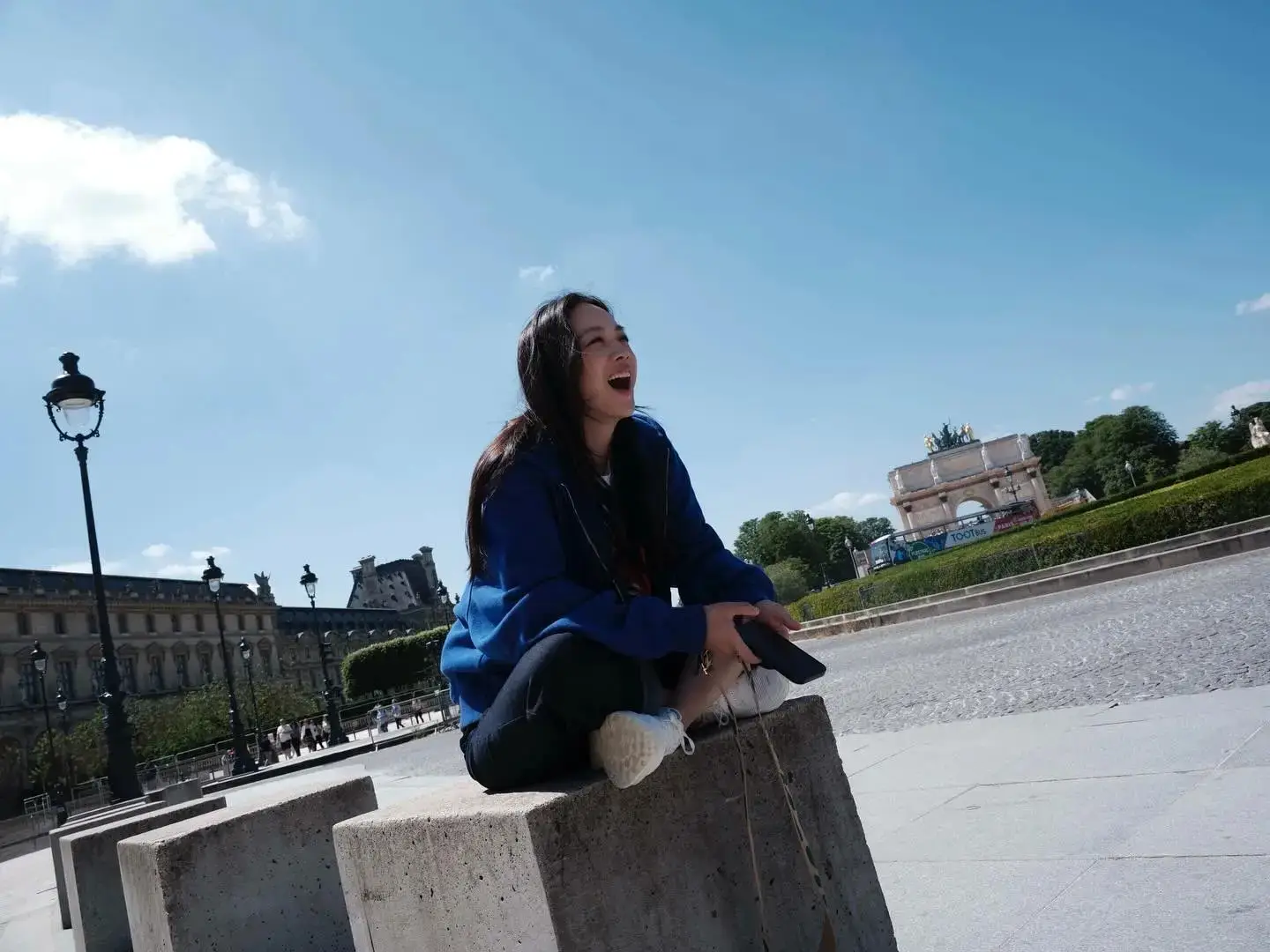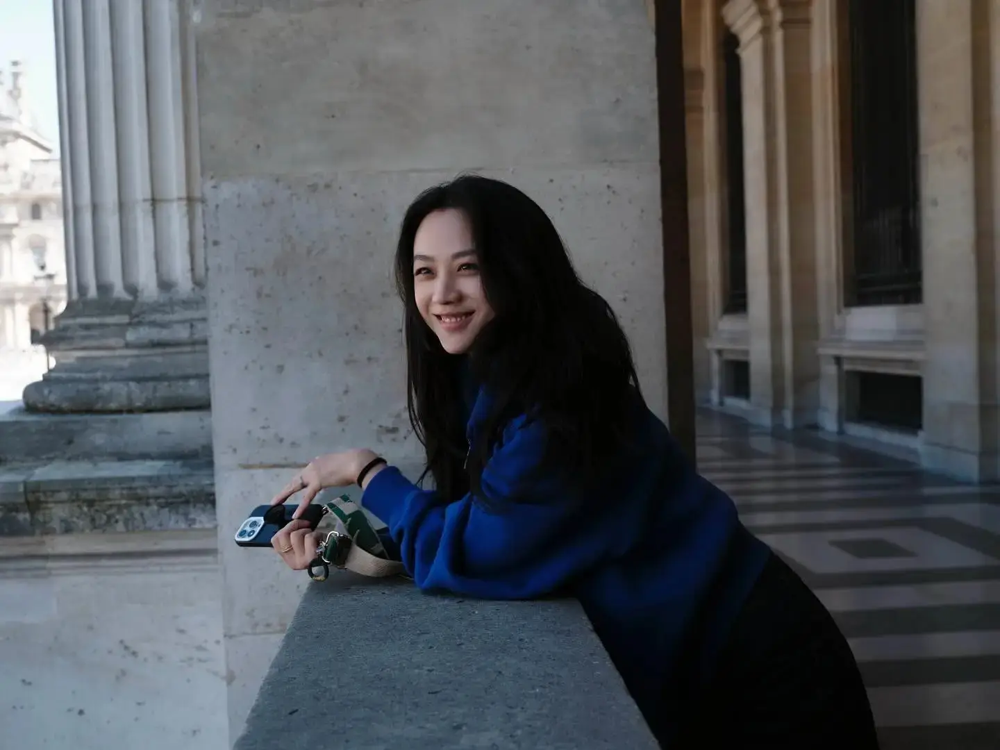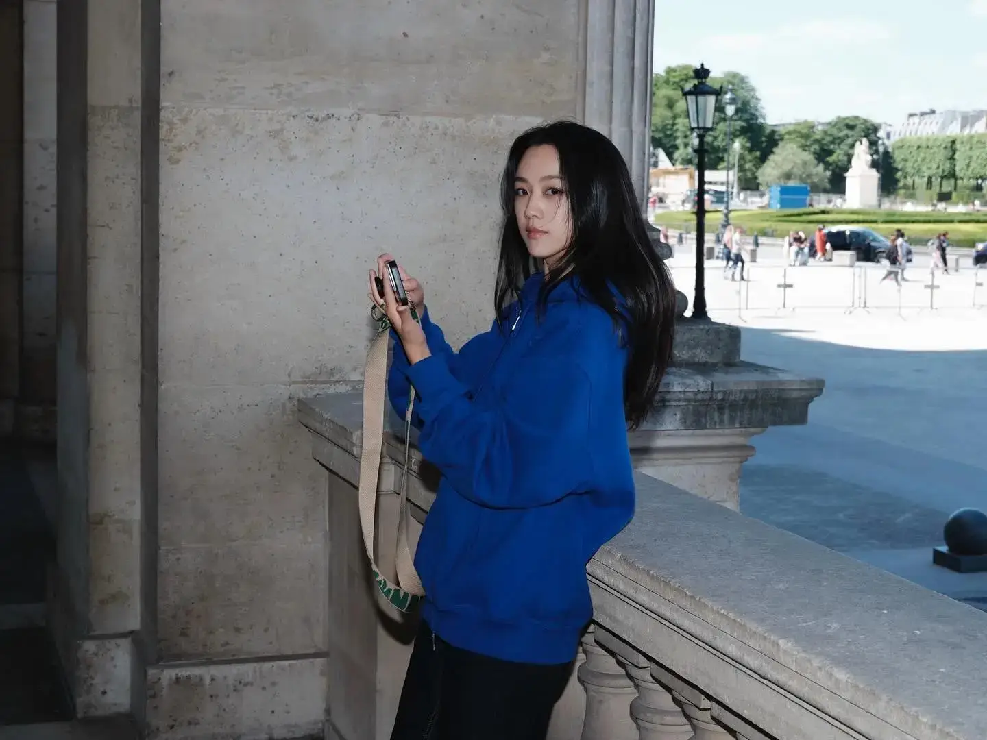 湯唯穿藍衣白鞋漫步巴黎 手持相機慵懶自在