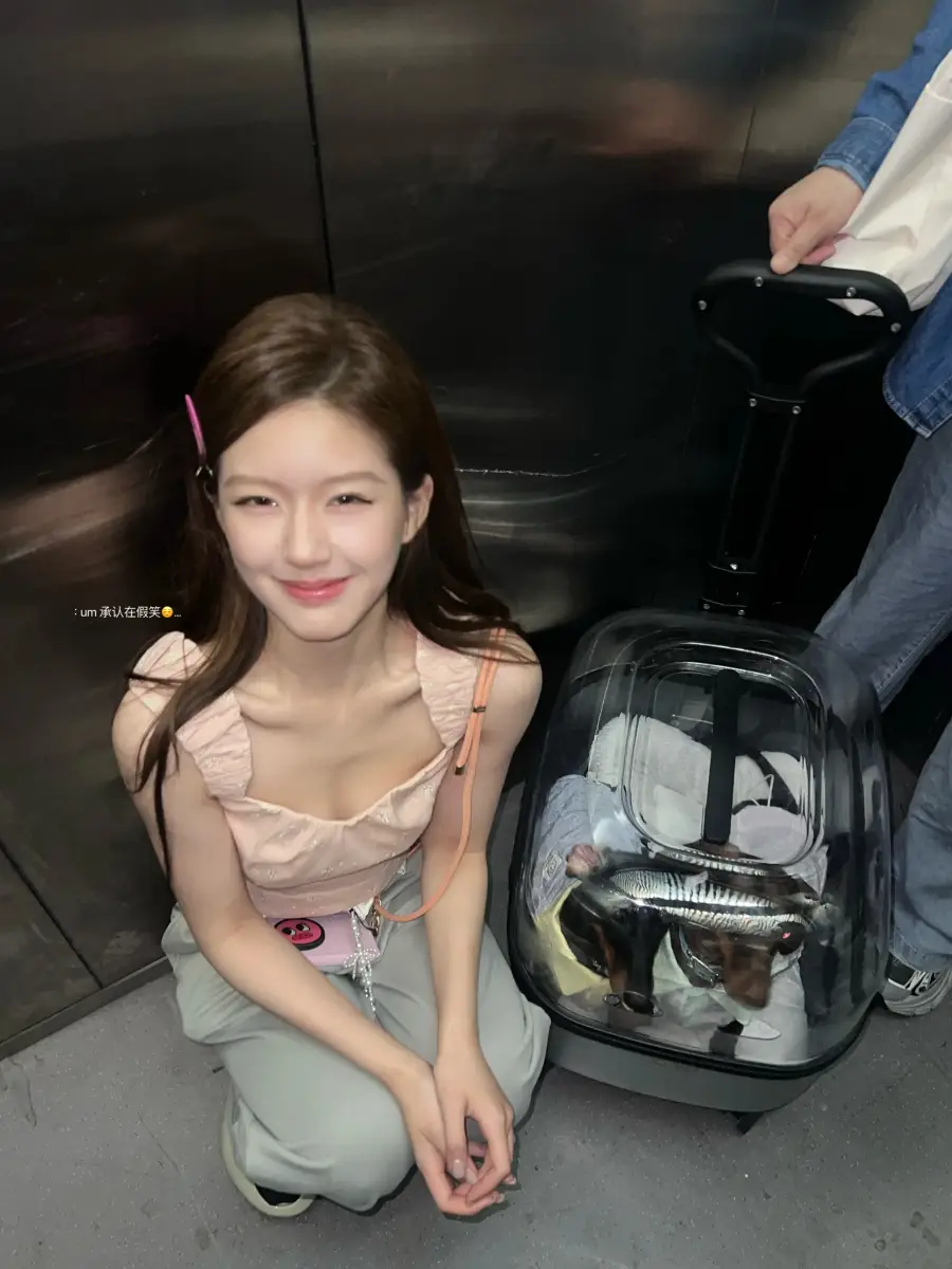 趙露思低頭看小狗,小露香肩清純誘惑。