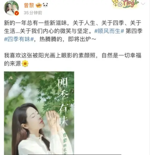8月4日,曾黎(明星經(jīng)紀公司)在社交媒體平臺上發(fā)文稱:“品嘗過酸甜苦辣,就能懂得人生如同四季。新書上線倒計時3天”,官宣新書。