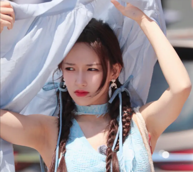 程瀟雙麻花編發(fā)可愛清純 藍色吊帶盡顯曼妙曲線