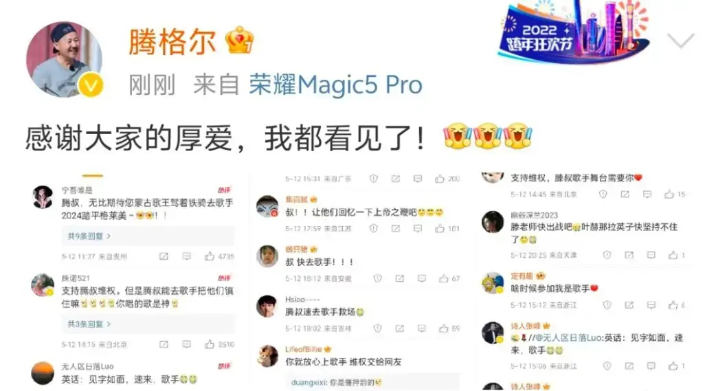5月12日,騰格爾在個(gè)人社交賬號(hào)發(fā)文,回應(yīng)了網(wǎng)友們喊話他上《歌手》的請(qǐng)求,并表示:感謝大家的厚愛,我都看見了。