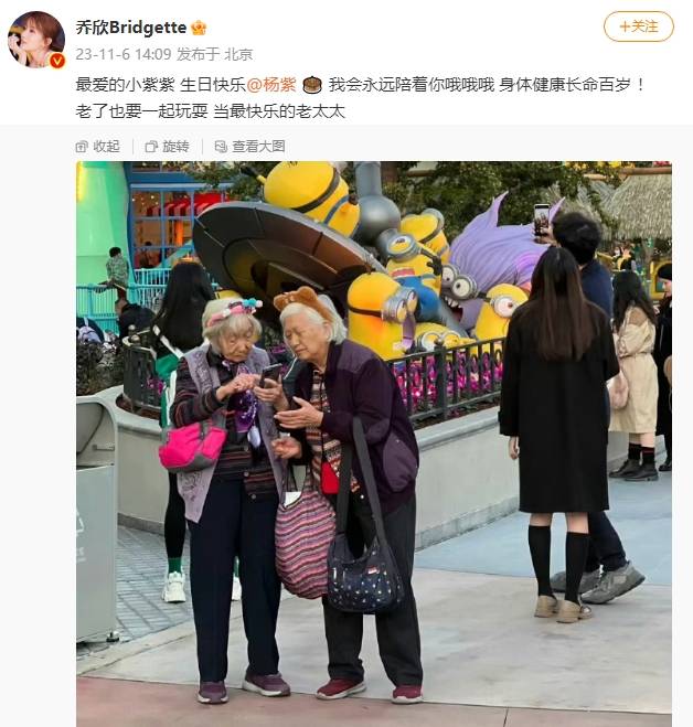 11月6日,喬欣在個(gè)人社交賬號(hào)上發(fā)文為楊紫慶生,喬欣曬出了一張兩個(gè)老太太的合照,并配文:最愛的小紫紫,生日快樂(lè),我會(huì)永遠(yuǎn)陪著你哦哦哦,身體健康長(zhǎng)命百歲!老了也要一起玩耍,當(dāng)最快樂(lè)的老太太。
