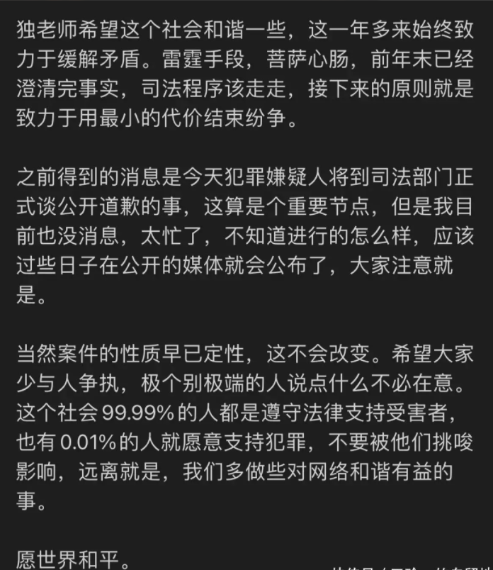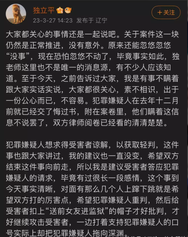 近日,霍尊的經(jīng)紀(jì)人獨立平在社交賬號發(fā)文透露了霍尊與陳露案件的最新情況。