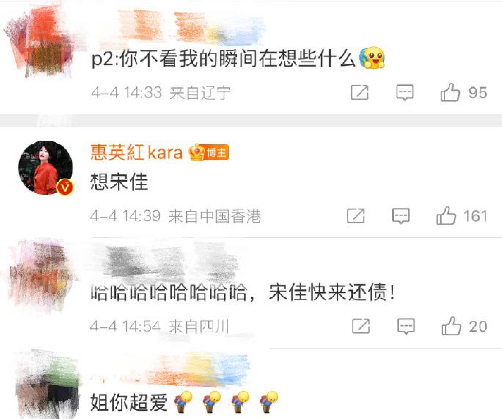 惠英紅(明星經(jīng)紀(jì)公司)在線回復(fù)網(wǎng)友評論,網(wǎng)友提問“圖2你不看我的瞬間在想什么”,惠英紅趣味回復(fù)“想宋佳”,二人關(guān)系親密惹人羨慕。