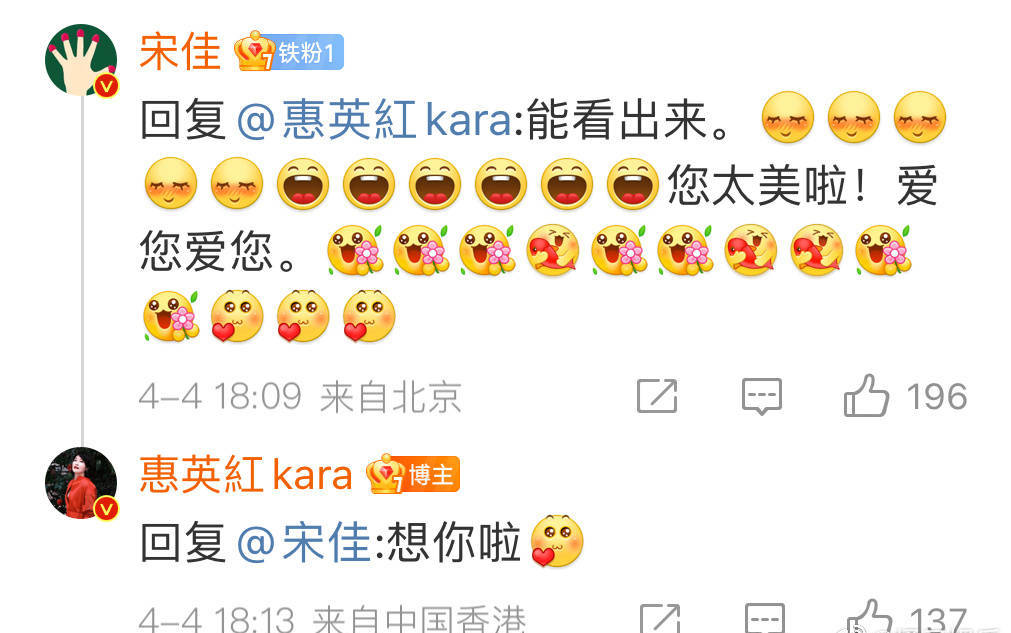 當(dāng)天,惠英紅在評論區(qū)高調(diào)表白宋佳“我想你了” ,宋佳(明星代言公司)回應(yīng)道:“能看出來,您太美啦!愛您愛您。”隨后,宋佳又表示:“我約您能約到嗎?”惠英紅稱:“你約我能約不到嗎?你少飛一點,少親兩口別的美女,就能擠出時間跟我拍雜志了。”二人互動十分逗趣,關(guān)系超親密。