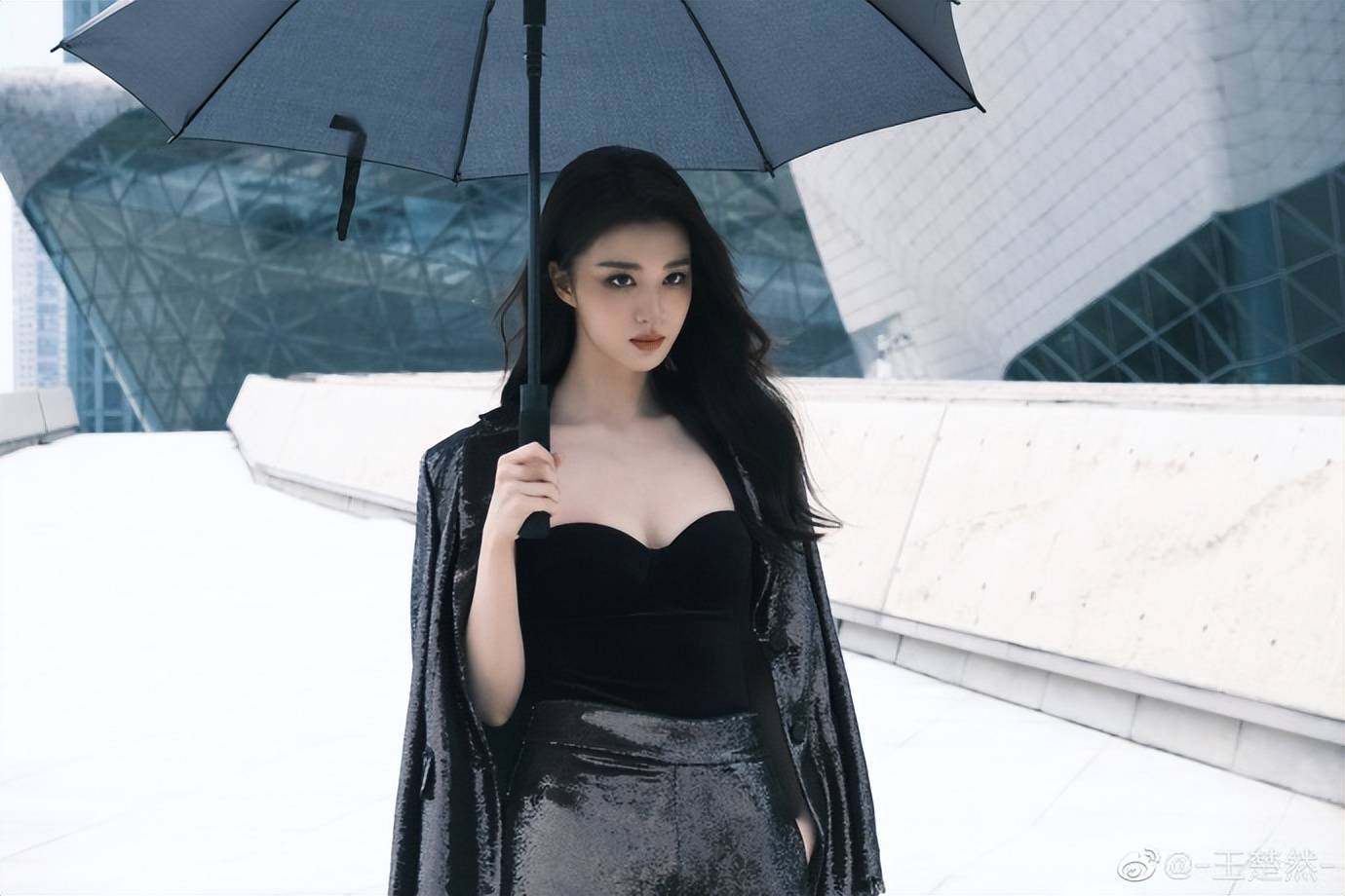 王楚然穿黑色吊帶上衣,披著黑色馬甲,搭配黑皮長褲,俏臉清麗脫俗,濃眉大眼,烈焰紅唇,露出自己傲人的乳溝,這位女星單手舉著黑傘,更讓自己的性感魅力猛增!