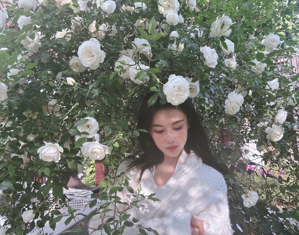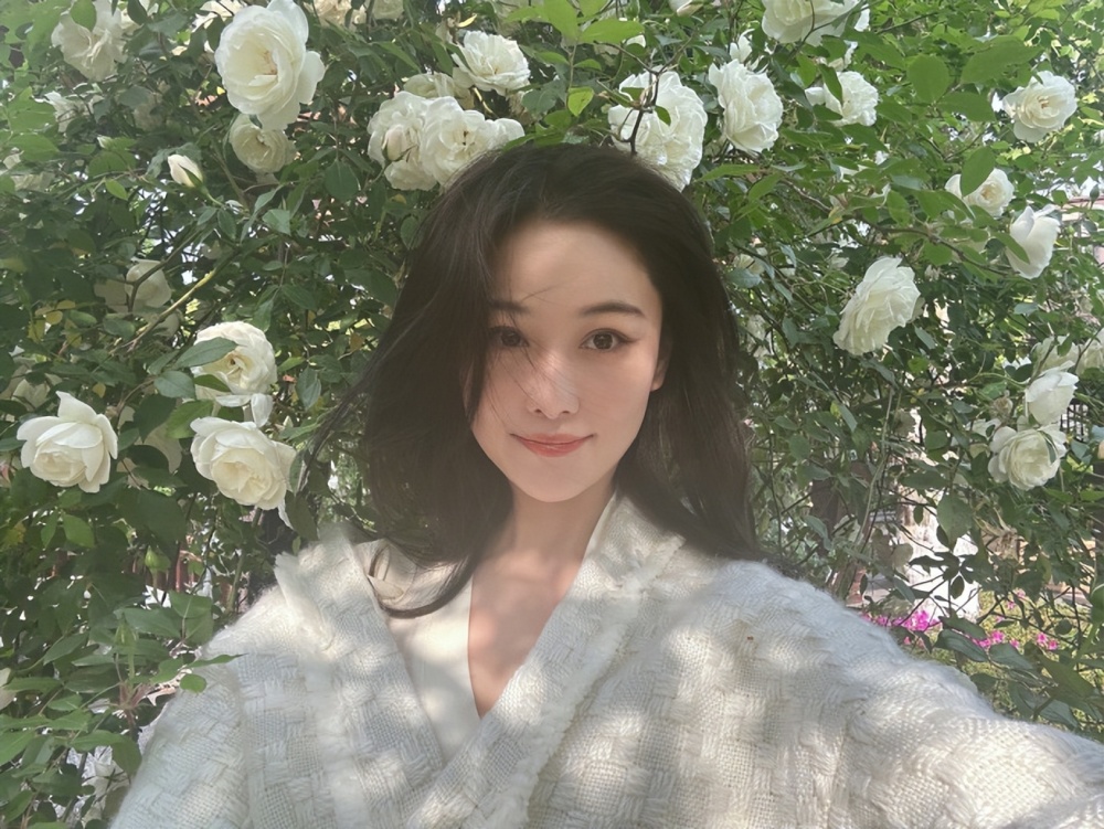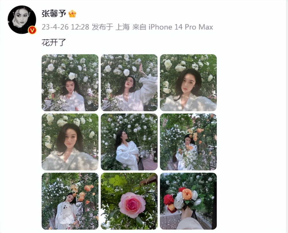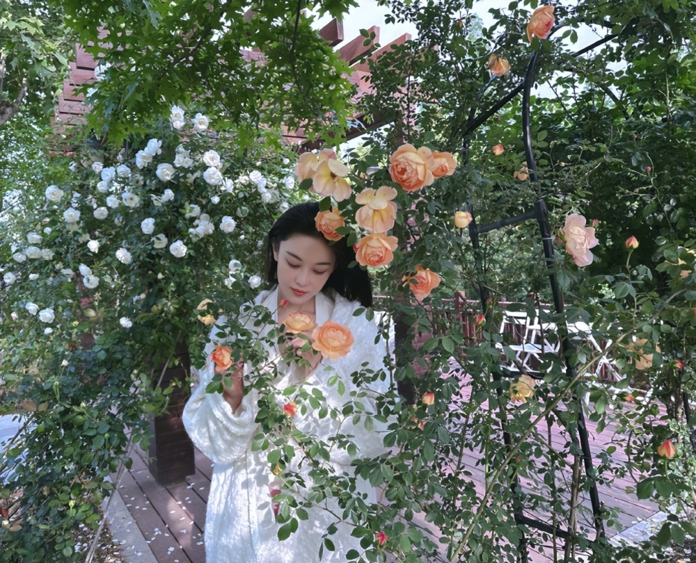 張馨予在自家花園拍照,老公視角下穿睡袍出鏡,完美演繹人比花嬌
