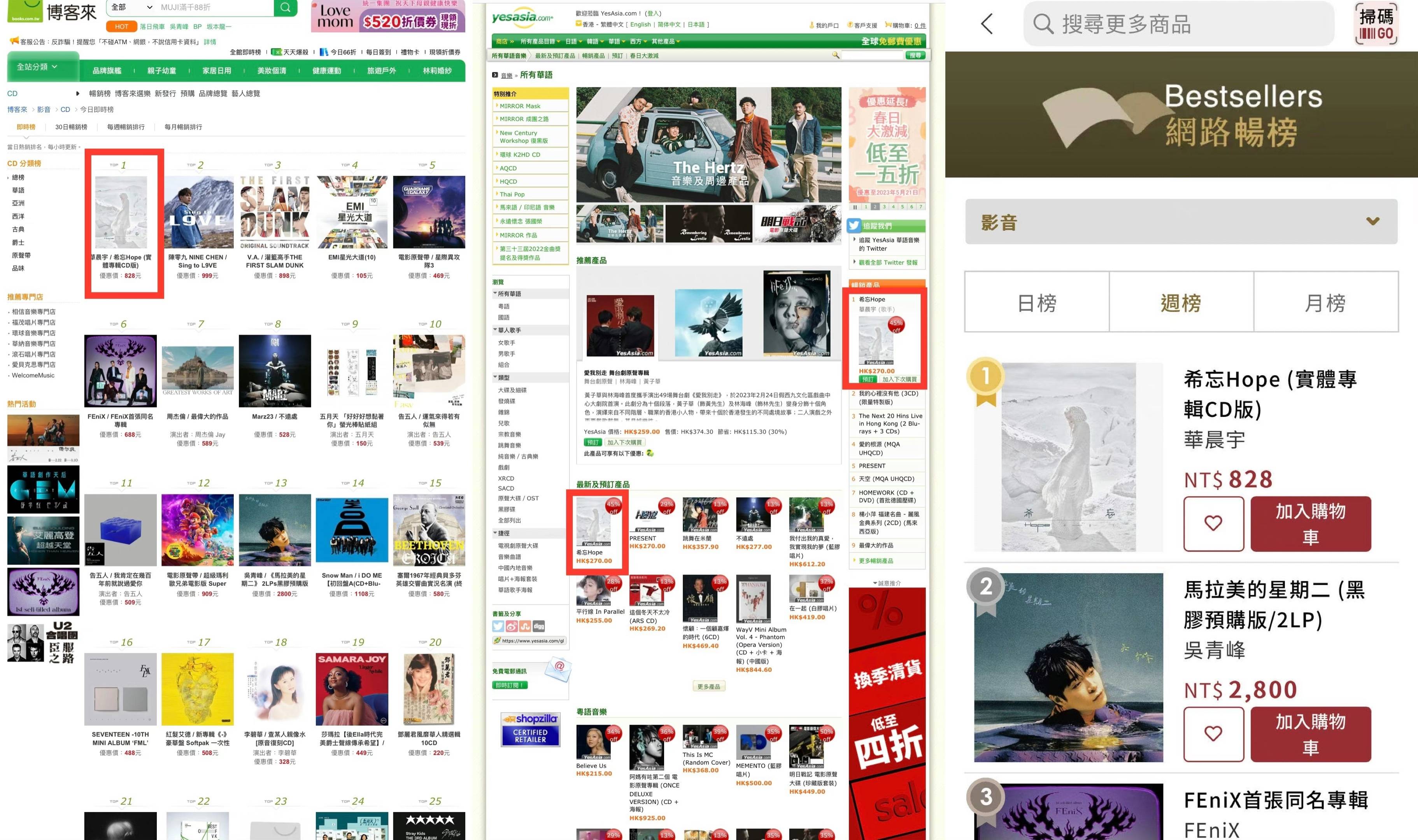 而不光在內(nèi)地的USB版本銷量驚人,在臺(tái)灣發(fā)行的CD版本更是刷屏各大平臺(tái):博客來即時(shí)榜 周榜雙第一,30天榜第六(僅上線一天成績)、佳佳熱銷第一、光南熱賣第一、yesasia暢銷第一、誠品周榜第一......已知歌迷團(tuán)購集中在5大,其他通道只能是臺(tái)灣本省歌迷購買,華晨宇這強(qiáng)大的號(hào)召力!