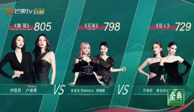 盧靖姍(盧靖姍經(jīng)紀(jì)公司)、劉惜君(劉惜君經(jīng)紀(jì)公司)深情對視演繹中英版《吻別》,最終得分805,超過了同為兩人組的龔琳娜、美依禮芽《花?!返?98分。