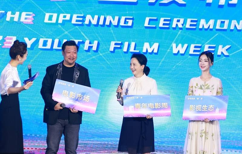賈冰(賈冰經(jīng)紀(jì)公司)、陶慧敏、吳謹(jǐn)言出席,三人舉著牌子,談“電影市場(chǎng)”“青年電影周”“影視生態(tài)”!