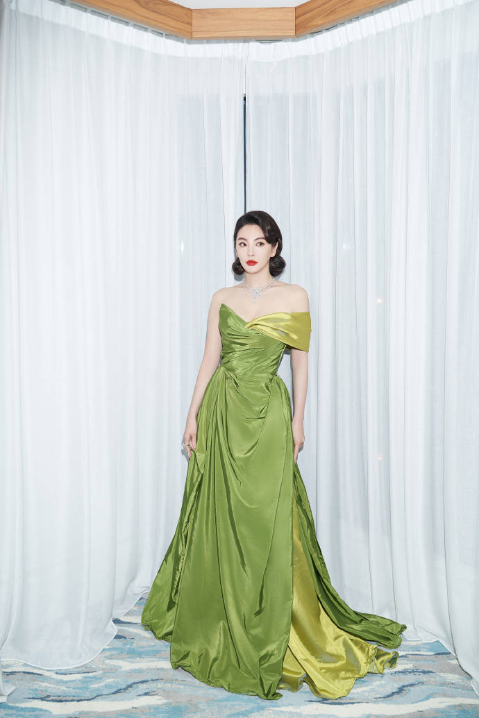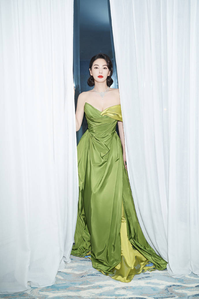 張雨綺身穿綠色抹胸裙,她俏臉成熟嫵媚,明眸善睞,唇紅齒白,烏黑的秀發(fā)梳在腦后,露出白皙的香肩和傲人的事業(yè)線,這位女星雙手扶著窗簾,將自己性感魅力提升到最大值!
