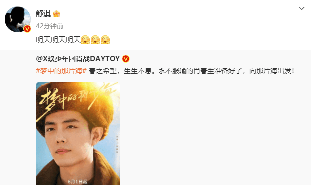 5月31日,舒淇(明星經(jīng)紀(jì)公司)在社交平臺(tái)上為肖戰(zhàn)新劇《夢(mèng)中的那片海》宣傳,她激動(dòng)地配文道:“明天明天明天”,看起來(lái)十分期待!