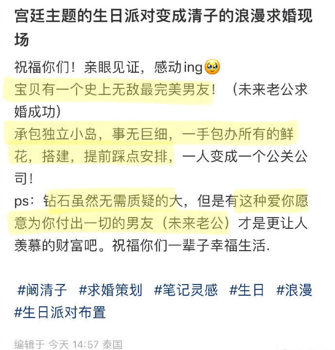 5月31日,闞清子(明星經(jīng)紀公司)好友在社交平臺上發(fā)文,透露闞清子男友為闞清子承包獨立小島補過生日,并一手包辦將小島打造成浪漫的求婚現(xiàn)場,求婚鉆戒更是無需質(zhì)疑的大,還夸他是史上無敵最完美男友。
