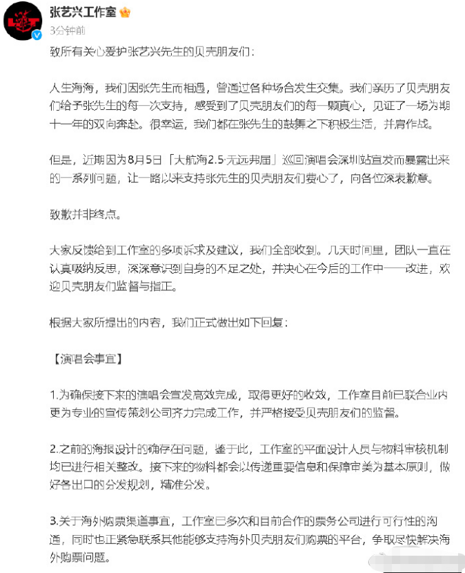 6月7日,張藝興(明星經(jīng)紀(jì)公司)工作室向長文向粉絲道歉,并再次回應(yīng)粉絲訴求,就演唱會(huì)、日常宣傳、與粉絲溝通、妝發(fā)服攝、人員整改等問題做出回復(fù)。工作室還表示將重新出發(fā),用更高效、更踏實(shí)、更謙遜的方式守護(hù)大家共同的事業(yè)。