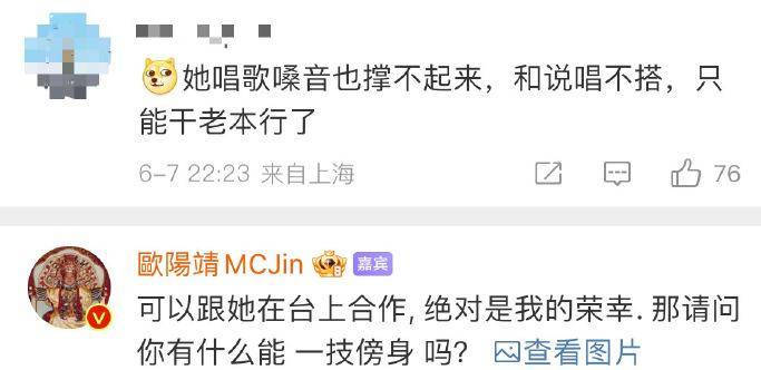 有網(wǎng)友評(píng)論道:“她唱歌嗓音也撐不起來,和說唱不搭,只能干老本行了。”隨后歐陽(yáng)靖回懟該網(wǎng)友,維護(hù)歐陽(yáng)娜娜:“可以跟她在臺(tái)上合作, 絕對(duì)是我的榮幸。 那請(qǐng)問你有什么能一技傍身 嗎?”