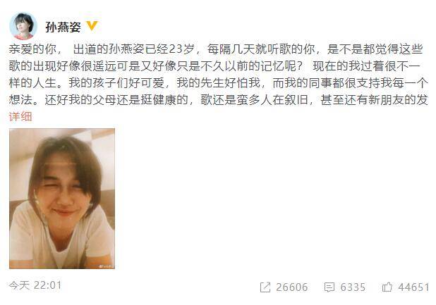 6月9日,孫燕姿(明星經(jīng)紀公司)在社交平臺發(fā)文慶出道23周年,寫道:“現(xiàn)在的我過著很不一樣的人生。我的孩子們好可愛,我的先生好怕我,而我的同事都很支持我每一個想法。還好我的父母還是挺健康的,歌還是蠻多人在敘舊,甚至還有新朋友的發(fā)現(xiàn),就這些就帶給我無比的快樂與驚喜。”