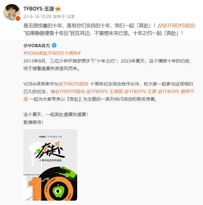 6月16日,TFBOYS(明星經(jīng)紀公司)十年之約紀念活動官宣,王俊凱、王源、易烊千璽在社交平臺官宣TFBOYS十年之約,與三位少年奔赴十年之約!