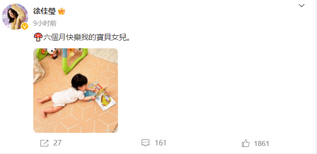 6月18日凌晨,歌手徐佳瑩(明星經(jīng)紀(jì)公司)曬出二胎女兒趴在地上的照片,配文“六個(gè)月快樂(lè)我的寶貝女兒。”去年12月17日,徐佳瑩在個(gè)人社交平臺(tái)分享自己喜得二胎的消息。