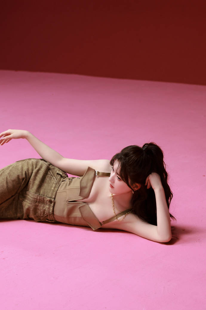 趙露思身穿棕色吊帶衣裳,搭配棕色緊身褲,她躺在粉色攤子上,單手托著腦袋,特意露出自己的事業(yè)線,雖然她不屬于豐滿的身材,但這樣讓她的性感魅力猛增!