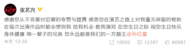 星全文化明星經紀公司資訊:8月16日張藝興發(fā)文為孫紅雷慶生,這已經是他連續(xù)九年為孫紅雷送上生日祝福:“感謝您從不吝嗇對后輩的夸贊與提攜,感恩您在演藝之路上對我毫無保留的幫助,在每次出演作品時都會想到我,給我機會、教我演戲。在您生日之際,祝您生日快樂,身體健康!咱一輩子的兄弟,您永遠都是我們的一方顏王。”
