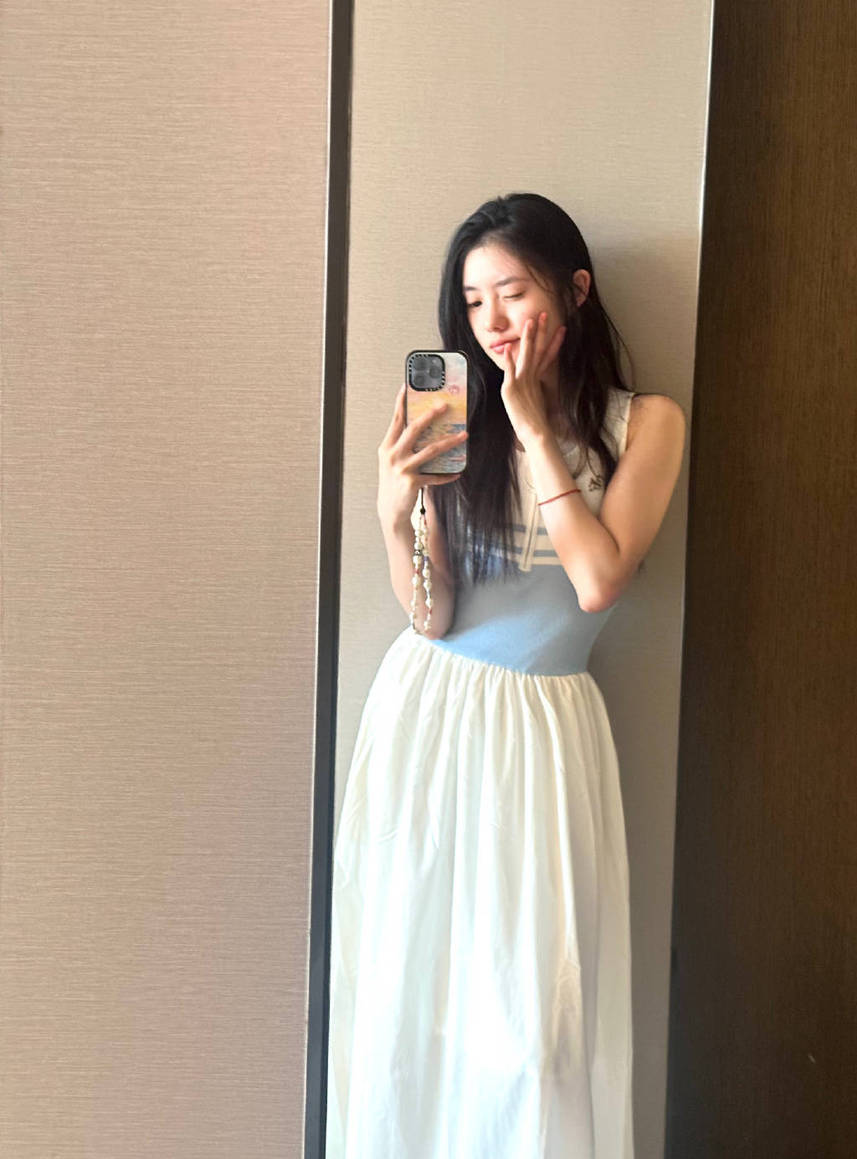劉浩存藍(lán)白連衣裙清新可人。