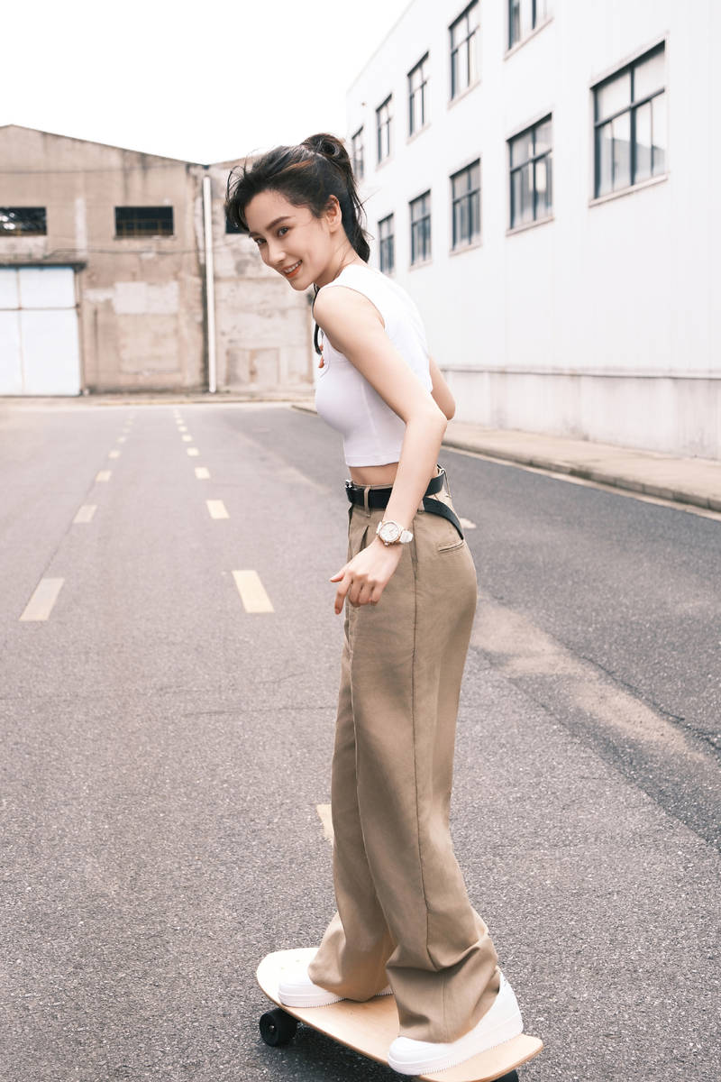 楊穎身著露腰上衣玩滑板 身材凹凸有致少女感十足