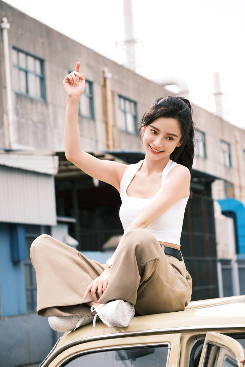 楊穎坐在車頭上,十分俏皮可愛(ài)。